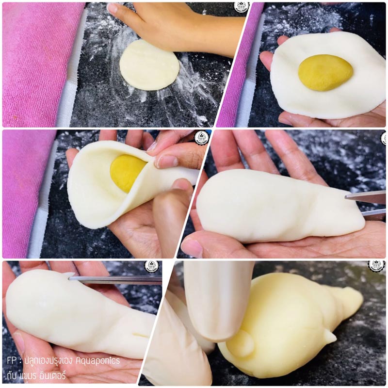 และปิดไ ส้ให้เรียบร้อย จากนั้นใช้กรรไกรตัดทำหางและครีบ ปั้นแป้งชิ้นเล็ก ๆ มาทำปากหรือจมูก