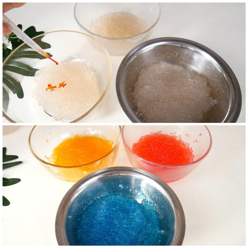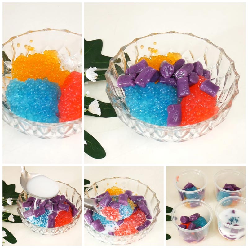 ★ แบ่งสาคูเป็น 3 ส่วน สำหรับ 3 สี ใส่สีผสมอาหารตามชอบ (ตามภาพใช้สีส้ม สีแดง และสีฟ้า) พักไว้