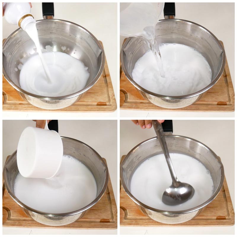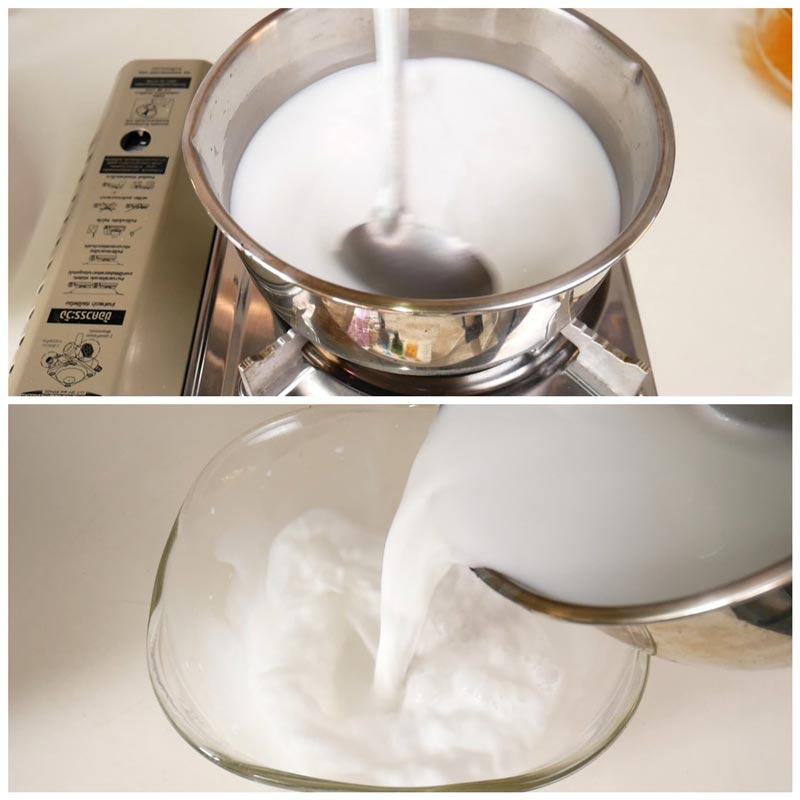 ★ ทำกะทิสดโดยนำกะทิ น้ำเปล่า น้ำตาลทราย และเกลือ ใส่ลงในหม้อ คนให้น้ำตาลละลาย