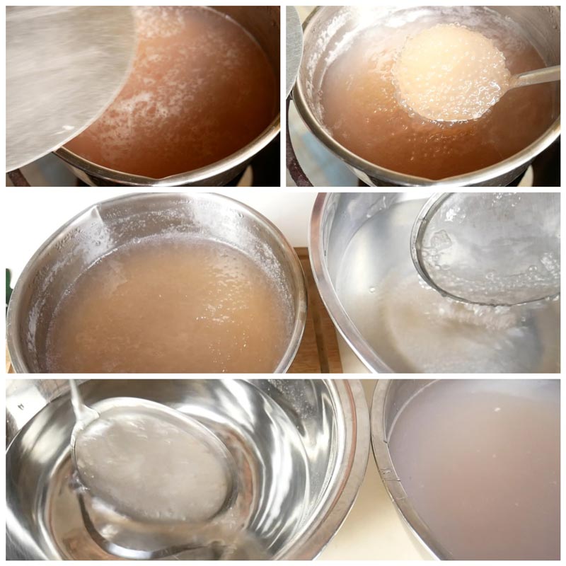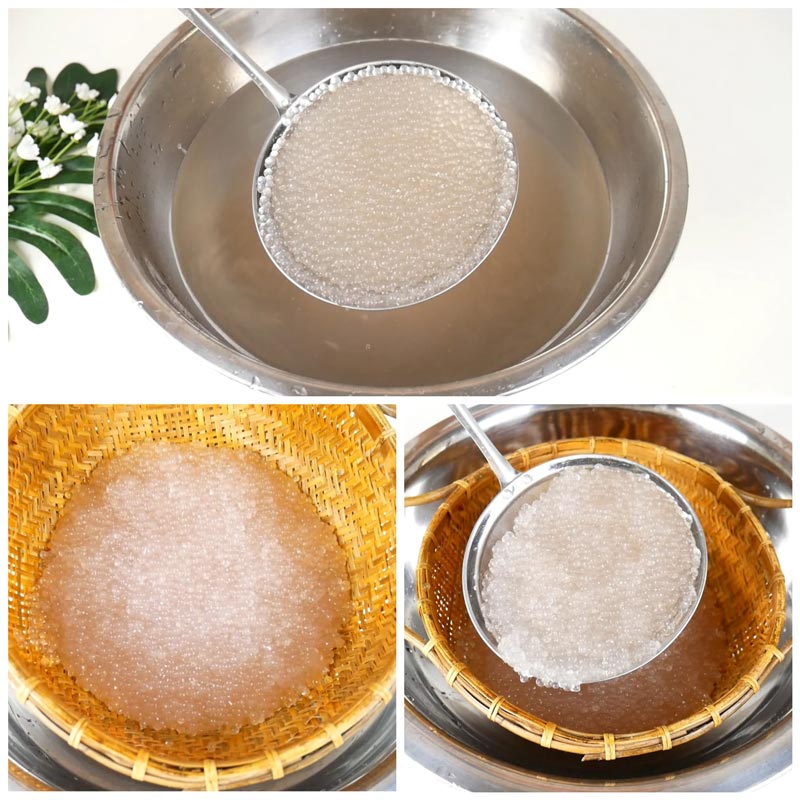 ★ เมื่อครบเวลาให้ตักสาคูขึ้นจากหม้อ และล้างน้ำประมาณ 3 น้ำ เพื่อล้างแป้งและความเหนียวออก