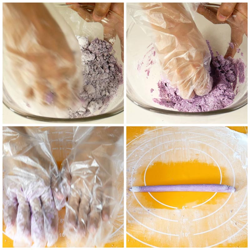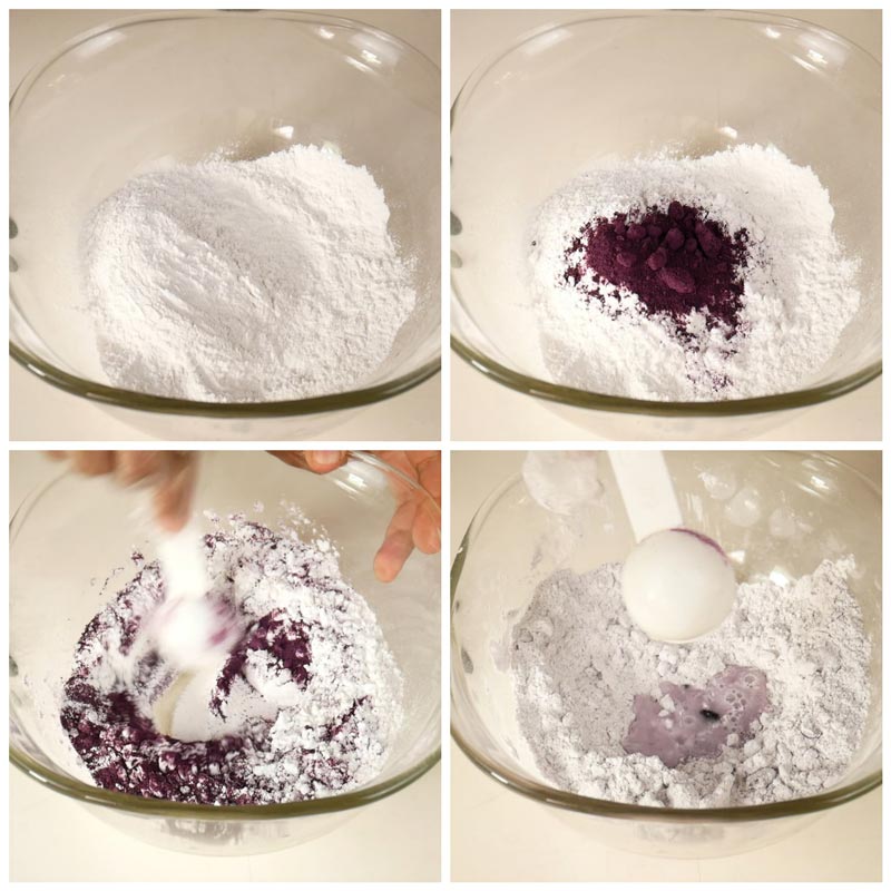 ★ ทำทาโร่บอล โดยผสมแป้งมัน แป้งข้าวเหนียว และผงมันม่วง คนให้เข้ากัน และทยอยใส่น้ำเปล่าลงไป