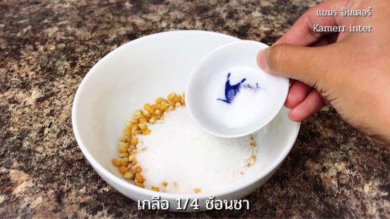 1.ใส่เมล็ดข้าวโ พ ดดิ บลงในชาม เติมน้ำตาลทรายและเกลือ เตรียมไว้