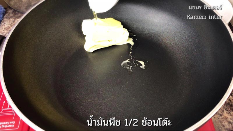 2.ตั้งกระทะใส่เนยลงไป ใช้ไ ฟอ่อน เติมน้ำมันพอละลาย