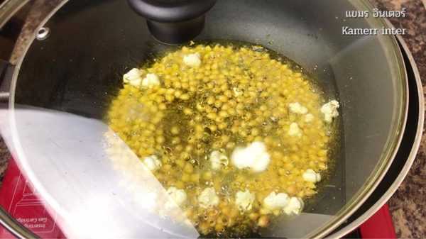 3.ใส่เมล็ดข้าวโ พ ดลงไป เอาฝาหม้อปิด