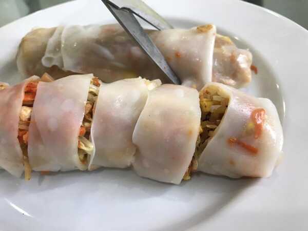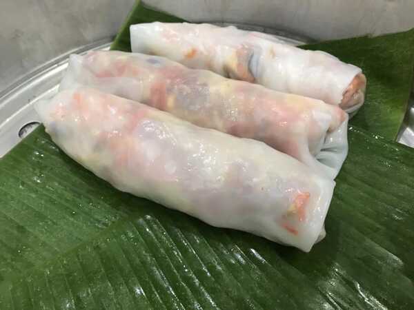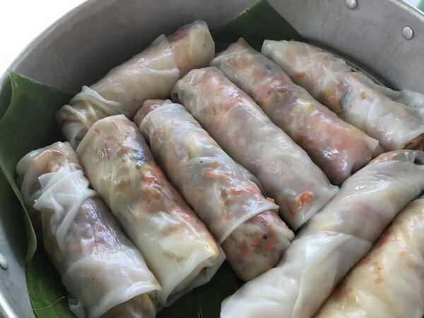 ► ตักไส้วางลงบนเส้นใหญ่ ห่อแบบง่าย ๆ นำไปนึ่ง ทาน้ำมันเคลือบกันเส้นติด