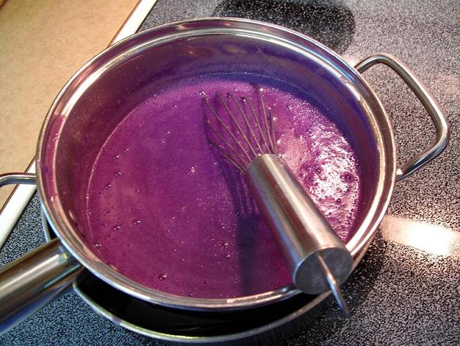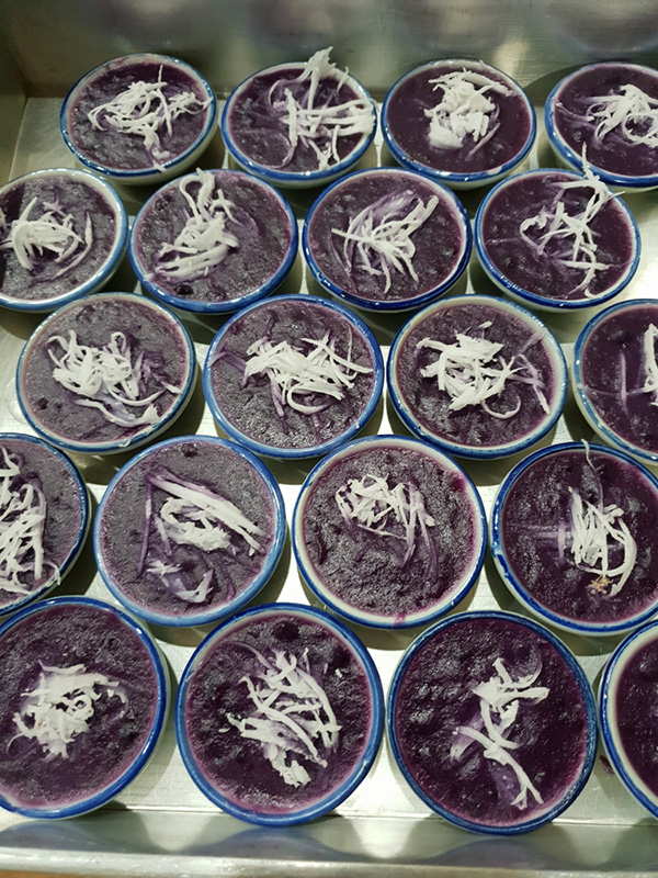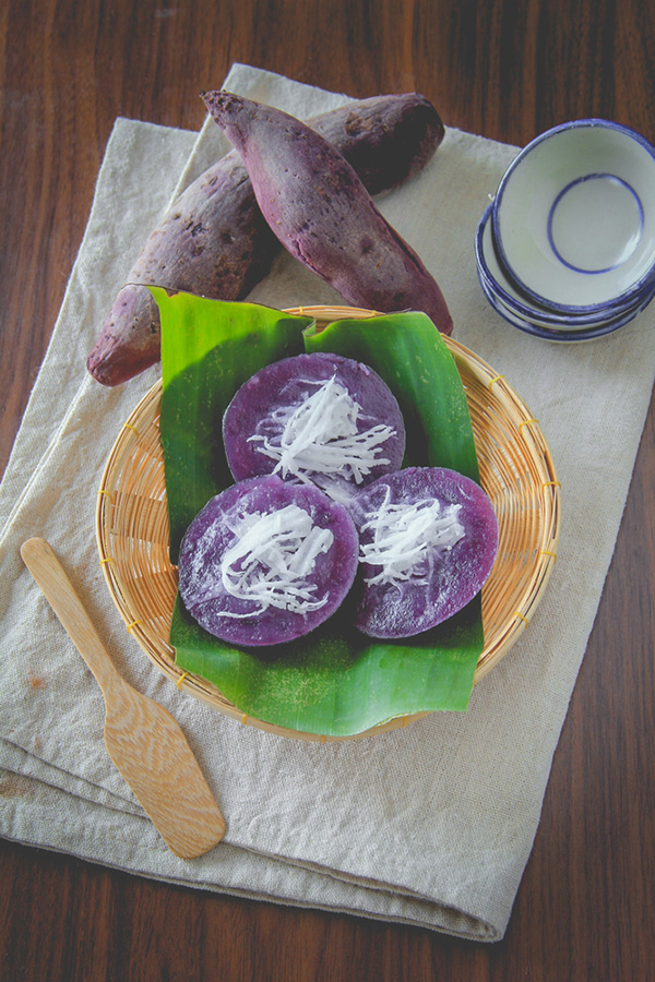 2. ตั้งลังถึง ใส่น้ำลงไปต้มจนเดือด เปิดฝา ใส่มันม่วงลงไป นึ่งประมาณ 20-30 นาที เช็กความสุกโดยใช้ไม้หรือส้อมจิ้มลงไป ถ้าจิ้มทะลุแสดงว่าสุกแล้ว