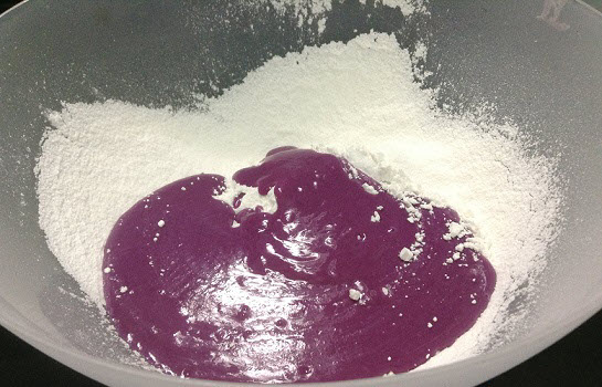 2. ใส่มันม่วงลงไป นวดจนเข้ากัน ไม่ต้องบี้มันม่วงละเอียดมาก เวลากินจะได้รสสัมผัสของเนื้อมันม่วง พักไว้ 15 นาที