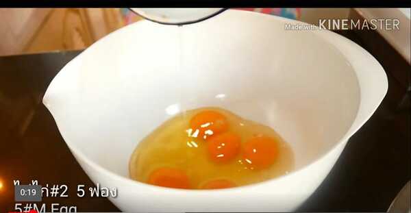 ☆ ใส่ไข่ลงในชามผสม ตีด้วยความเร็วปานกลางสักครู่ หลังจากนั้นทยอยใส่น้ำตาลทรายจนหมด สลับกับการตีจนเข้ากัน