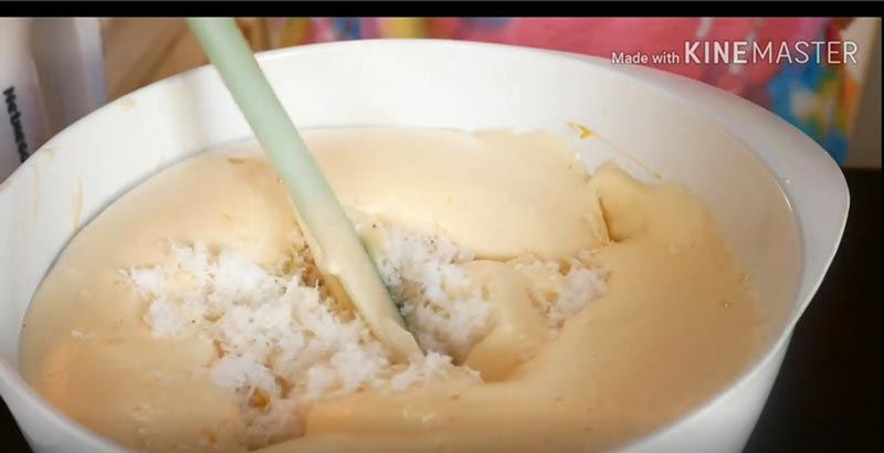 ☆ เมื่อส่วนผสมขึ้นฟูแล้วให้ใส่มะพร้าวขูดขาวโดยให้ใช้พายตะล่อมให้ส่วนผสมและมะพร้าวเข้ากัน
