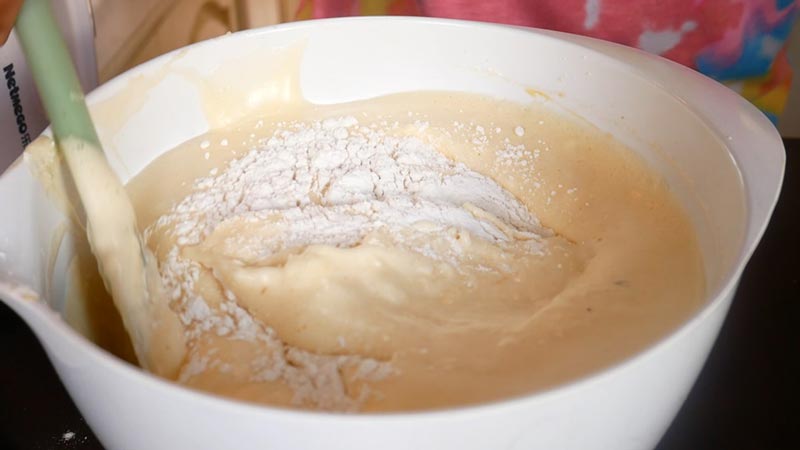 ☆ ทยอยใส่แป้งที่ร่อนพร้อมผงฟูไว้โดยใส่แป้งสลับกับการคนตะล่อมให้แป้งไม่เป็นเม็ดขาว และให้เข้ากันกับส่วนผสมอื่น ๆ จนแป้งหมด