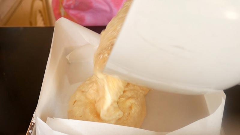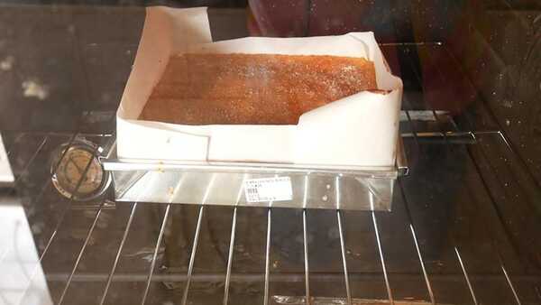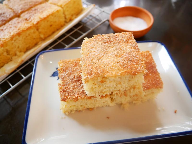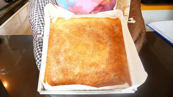 ☆ เทใส่ถาดที่กรุกระดาษไขโดยใช้ถาดขนาด 8x8x2 นิ้ว เกลี่ยให้หน้าขนมเรียบแล้วโรยน้ำตาลทรายให้ทั่วหน้าขนม