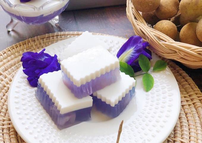 1. ใส่ผงวุ้นสำหรับทำขนม น้ำตาลทราย น้ำ และน้ำอัญชันคั้นลงในภาชนะ คนให้เข้ากัน นำขึ้นตั้งไฟ คนเป็นระยะจนส่วนผสมเดือดทั่ว
