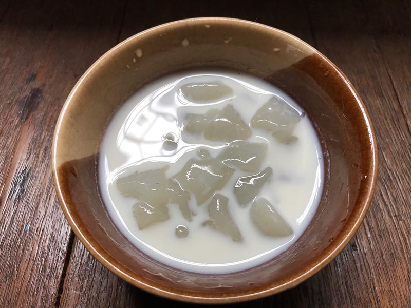 4. ตักบัวลอยขนมเข่งลงในถ้วย ราดนมสดลงไปตามชอบ เสิร์ฟแบบร้อน หรือเติมน้ำแข็งลงไปก่อนเสิร์ฟ