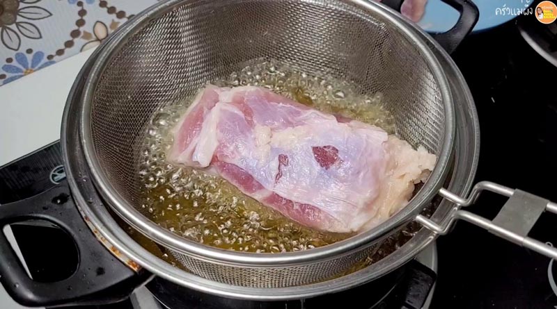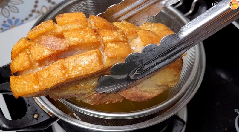 ► นำหมูที่แช่ฟรีซไว้มาทอดครั้งที่ 2 นำส่วนหนังลงทอดในน้ำมันร้อน ใช้ไฟปานกลางจนหนังกรอบฟู แล้วก็ทอดให้เหลืองกรอบน่ากินทั้งชิ้น