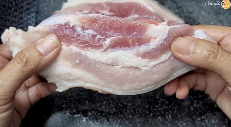 ► วิธีการเลือกหมูสามชั้นที่อร่อยให้เลือกชิ้นที่มีเนื้อหมูหนา ๆ และมีชั้นมันหมูแทรกบาง ๆ หนังหมูไม่หนามาก