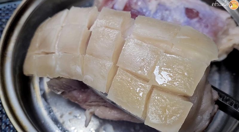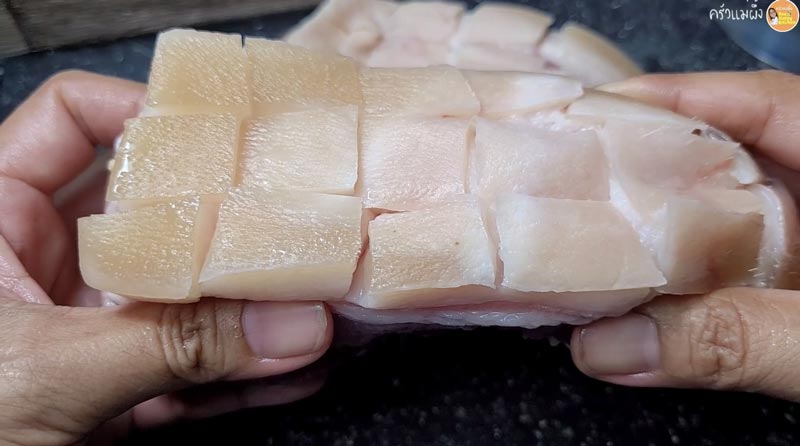 ► นำหมูมาบั้งให้หนังหมูเป็นริ้ว ๆ แบบนี้ จะทำให้เครื่องปรุงซึมเข้าไปในเนื้อง่าย และเวลาทอดออกมาจะกรอบฟูสวยน่ากิน