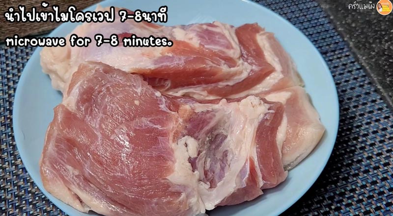 ► นำไปเข้าไมโครเวฟ ประมาณ 7-10 นาที หนังหมูจะเริ่มสุกและแข็งตัว