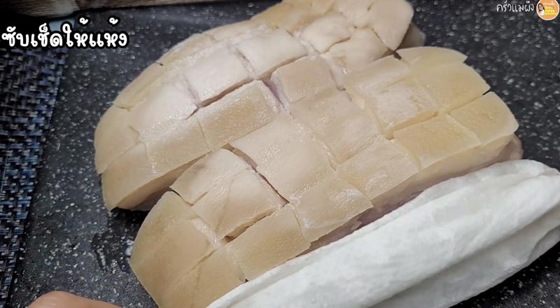 ► ใช้ผ้าหรือกระดาษซับชิ้นหมูให้แห้ง