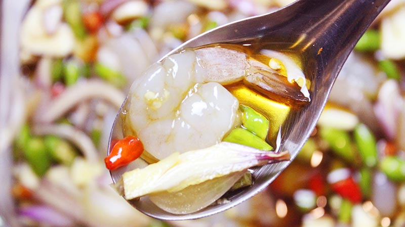 ◆ ในระหว่างนี้ลองชิมเพื่อปรับรสชาติได้ตามความชอบ เมื่อได้รสชาติที่ต้องการแล้วนำน้ำปลาดองราดบนกุ้งขาว