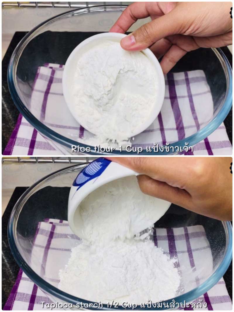 ► ใส่แป้งข้าวเจ้าและแป้งมันสำปะหลังลงไปคลุกเคล้าให้เข้ากัน