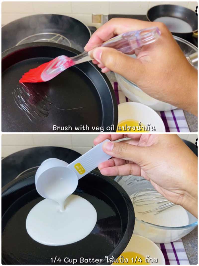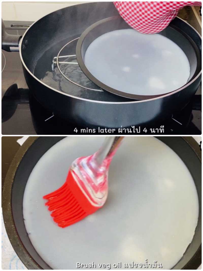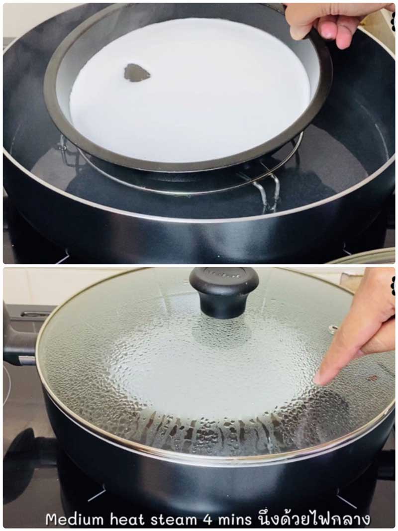 ► ใช้วิธีตะแคงถาดเอาหากชอบแป้งบาง ๆ และนึ่งโดยใช้ไฟกลาง ประมาณ 4-5 นาที หากไม่อยากให้หยดน้ำหยดลงที่ตัวแป้ง หาผ้าพันที่ฝาหม้อได้ค่ะ