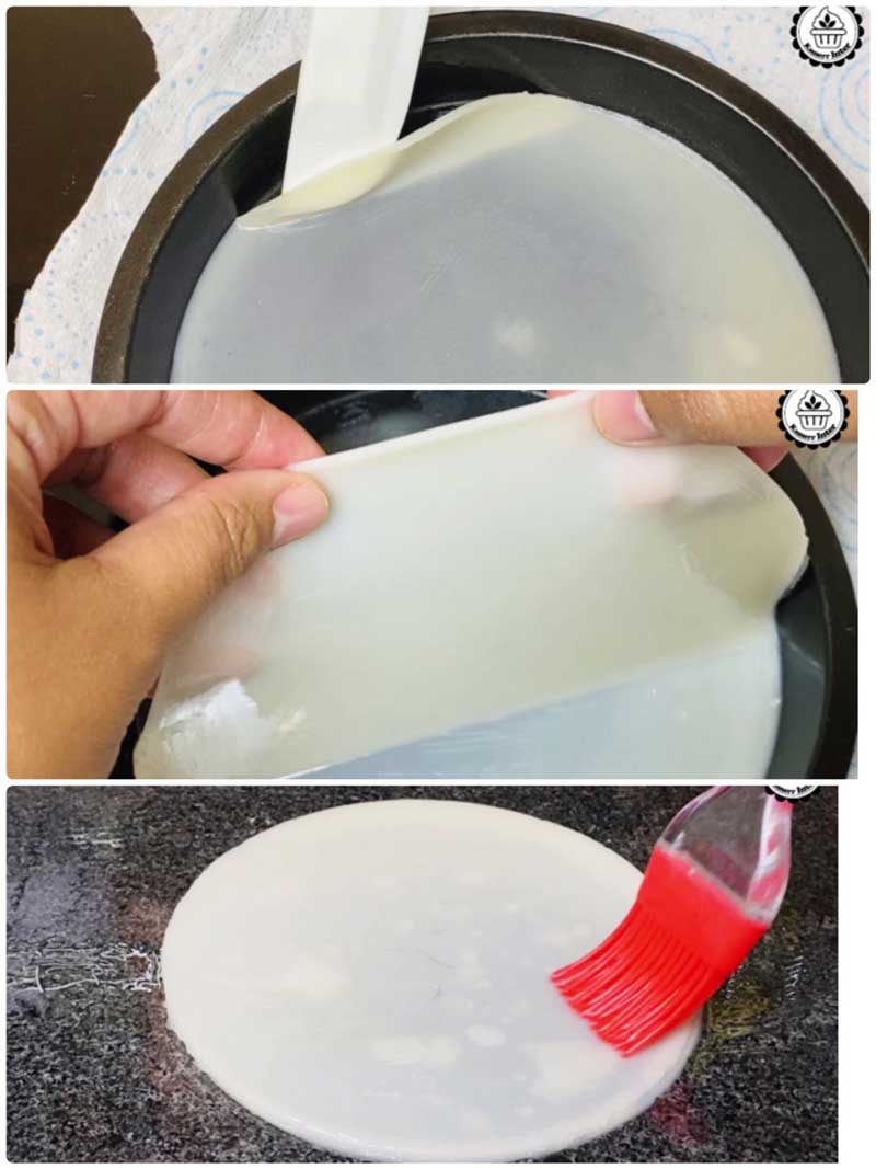 ► ลอกแผ่นแป้งในขณะที่ยังอุ่น ๆ จะทำให้ลอกง่าย และทำต่อจนกว่าแป้งจะหมด