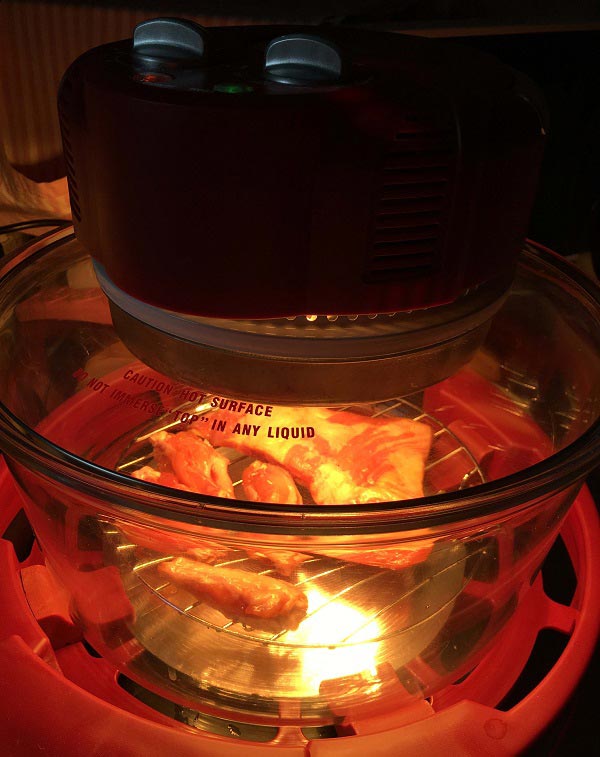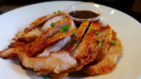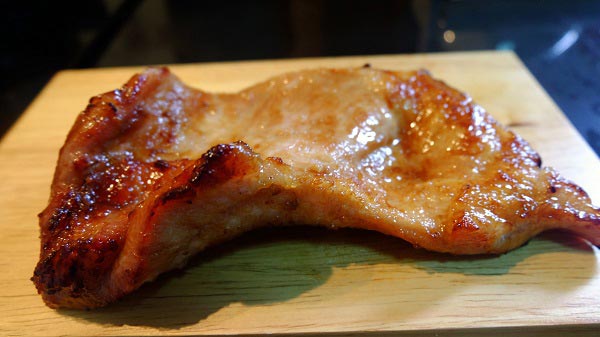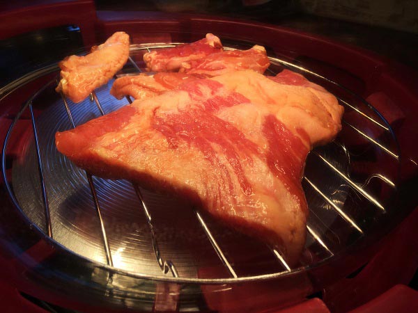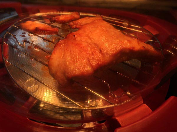 •​ นำคอหมูอบด้วยหม้ออบลมร้อนที่อุณหภูมิ 200-225 องศาเซลเซียส (หม้อที่ใช้เป็นหม้ออบกลมแบบลมร้อนฮาโลเจน) ประมาณ 20 นาที