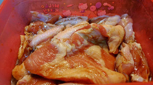 และใช้ส้อมจิ้มคอหมูให้ทั่วแล้วใส่ลงไปหมัก พักทิ้งไว้ในตู้เย็นประมาณ 30 นาที