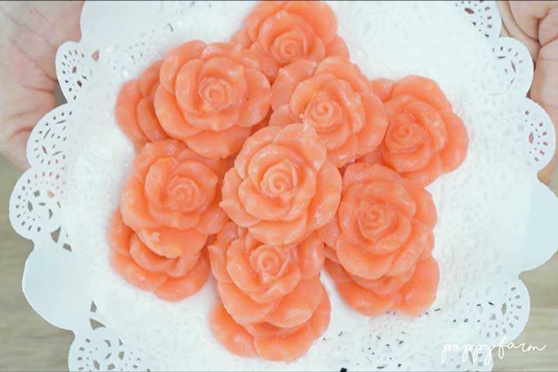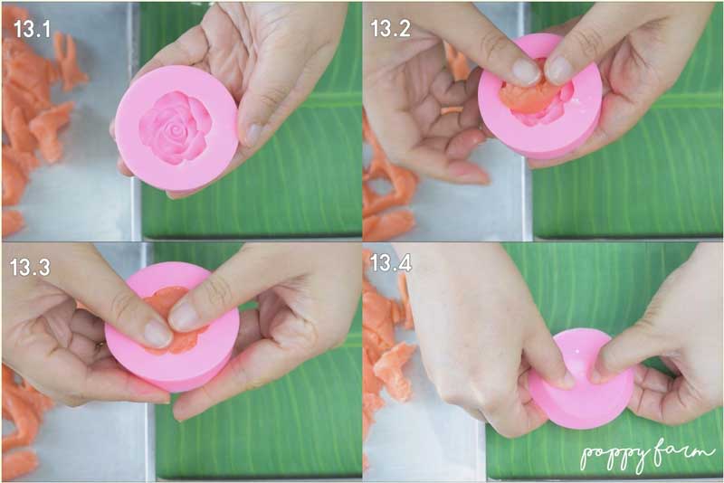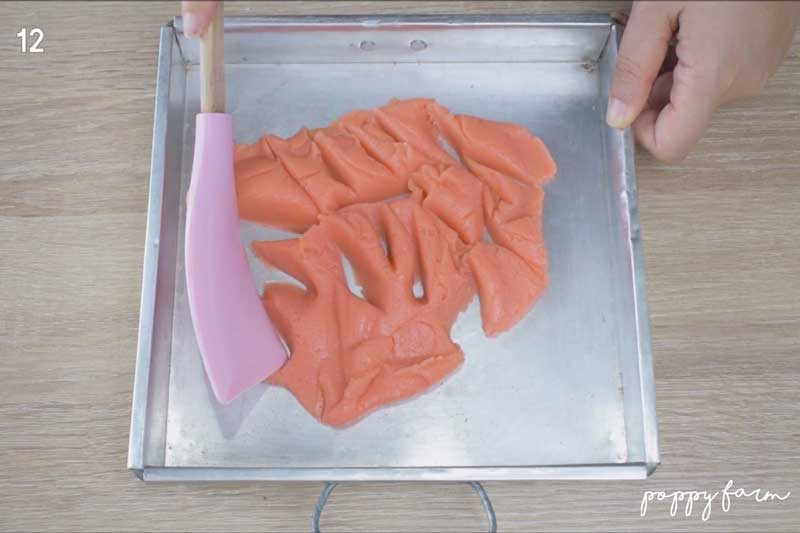 แกะออกจากพิมพ์ โดยดึงขอบพิมพ์ (ในกรณีที่เป็นพิมพ์ซิลิโคนสามารถดึงได้) แล้วเอานิ้วโป้งกดตรงกลางพิมพ์ให้ขนมค่อย ๆ หลุดออกมา
