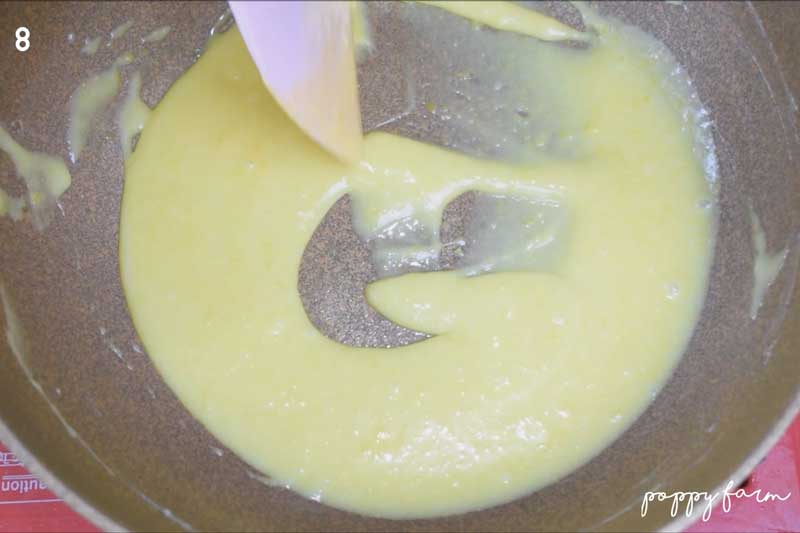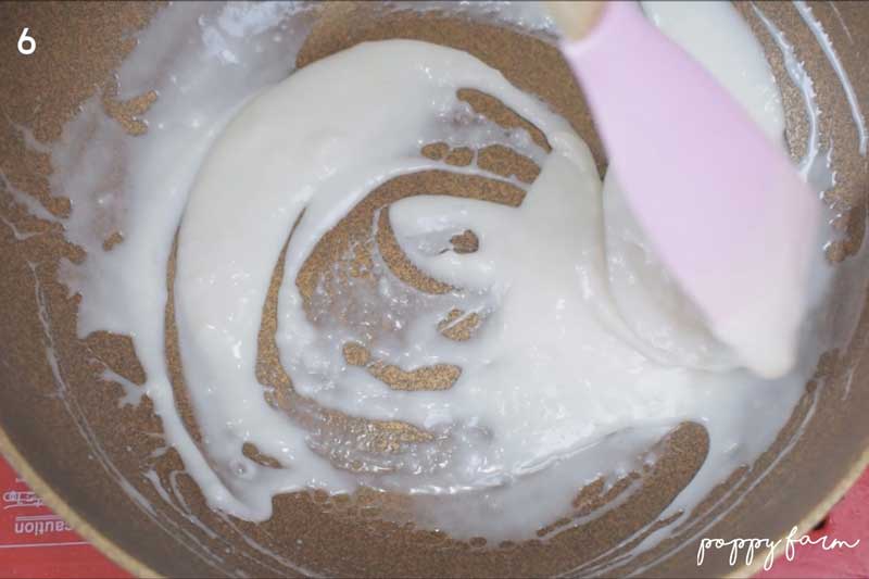 ► เมื่อส่วนผสมเข้ากันดีแล้ว ให้ “เปิดไฟ” อีกครั้ง กวนต่อด้วยไฟอ่อน