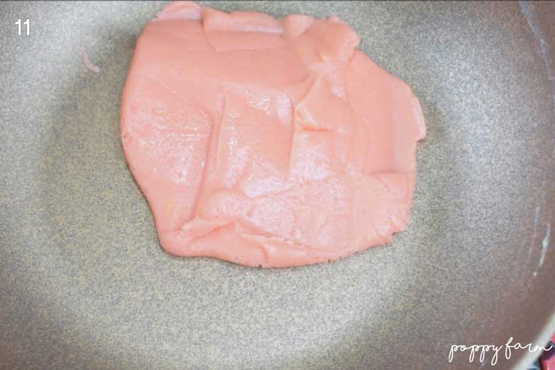 ► เมื่อส่วนผสมไม่ค่อยติดกระทะแล้ว ให้หยดสีชมพู ลงไป 2-3 หยด