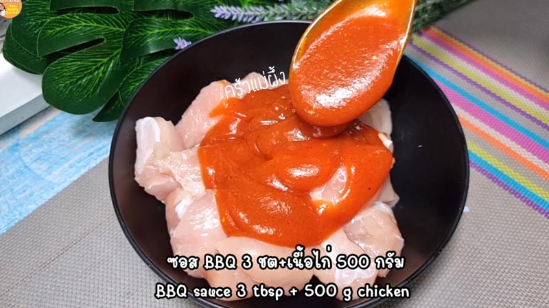 ◇ นำซอสบาร์บีคิว 3 ช้อนโต๊ะ หมักกับเนื้อหมู ไก่ คลุกเคล้าให้เข้ากัน ใส่น้ำมัน 1 ช้อนโต๊ะ เพิ่มความฉ่ำนุ่ม (ถ้าต้องการให้เนื้อนุ่มเร็วให้ใส่เนื้อสับปะรด 1 ช้อนโต๊ะ)