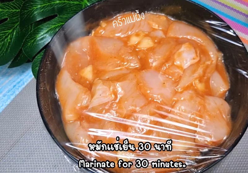 ◇ นำไปแช่ตู้เย็นหมักไว้ 30 นาที สำหรับซอสบาร์บีคิวที่เหลือเก็บไว้ทาตอนปิ้งบาร์บีคิว
