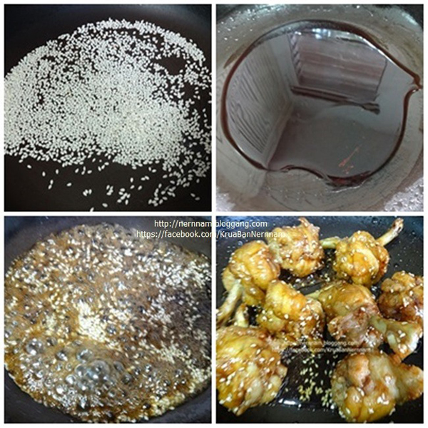 4. นำซอสเทอริยากิขึ้นตั้งไฟให้เดือดข้น ใส่งาขาวคั่ว ตามด้วยไก่ทอดลงไป คลุกเคล้าให้ทั่วกัน
