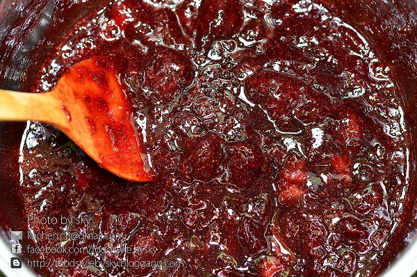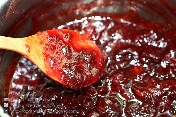 ► ใส่เนื้อสตรอว์เบอร์รีที่พักไว้ลงไป คนผสมให้เข้ากัน (หากต้องการให้เนื้อแยมเป็นลิ่มหรือแน่นกว่านี้ให้เพิ่มเจลาตินลงไปได้) พักไว้จนเย็น เก็บใส่ภาชนะแล้วนำแช่ตู้เย็น