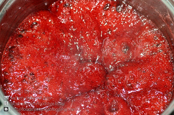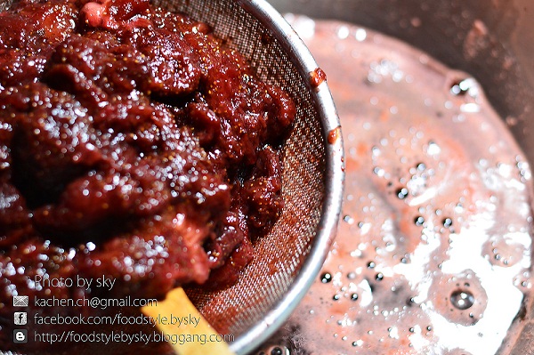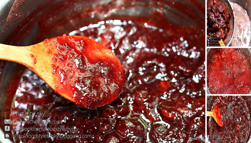 ► ใส่สตรอว์เบอร์รีลงในหม้อ นำขึ้นตั้งไฟ จากนั้นเติมน้ำลงไป ตามด้วยน้ำตาลทราย ต้มให้เดือดและหมั่นคนเป็นระยะ ๆ เคี่ยวจนสตรอว์เบอร์รีเริ่มนิ่ม จากนั้นกรองเอาเนื้อสตรอว์เบอร์รีออกพักไว้