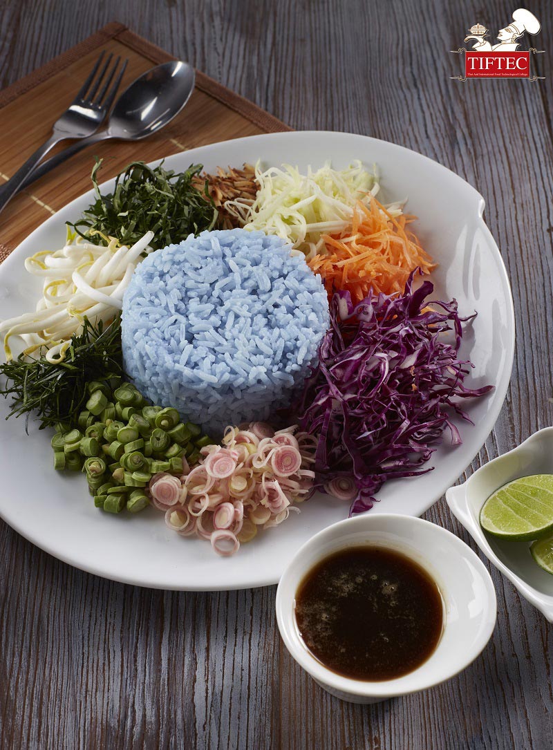 1. ตักข้าวอัญชันหุงสุกลงจานเสิร์ฟ