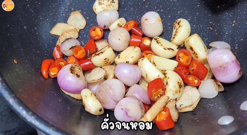 ☆ คั่วเครื่องน้ำพริก ได้แก่ พริก หอมแดง กระเทียม และข่า ในกระทะจนสุกหอม
