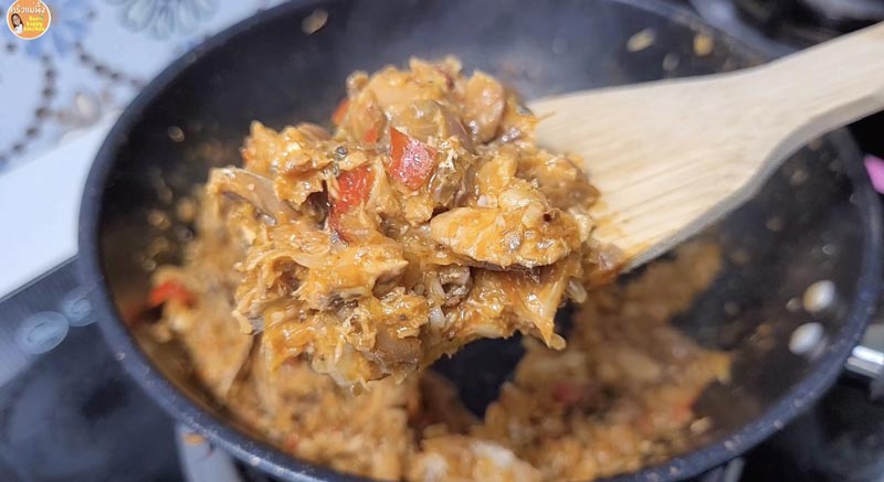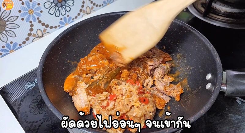 ☆ นำน้ำพริกและปลากระป๋องไปผัดคั่วในกระทะ ใช้ไฟอ่อน ๆ
