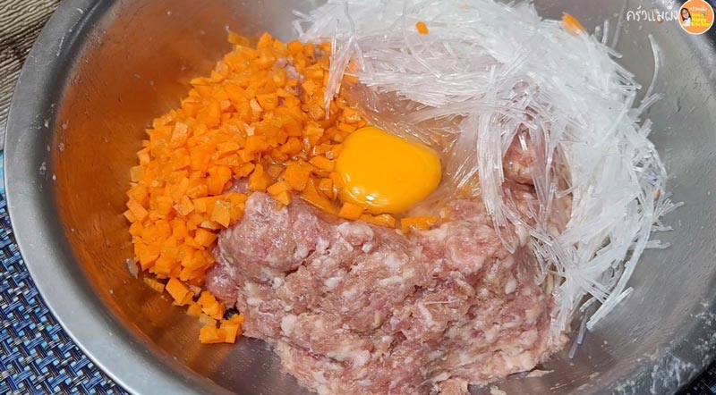 ► ใส่ไข่ แครอต และวุ้นเส้น ผสมทุกอย่างให้เข้ากัน