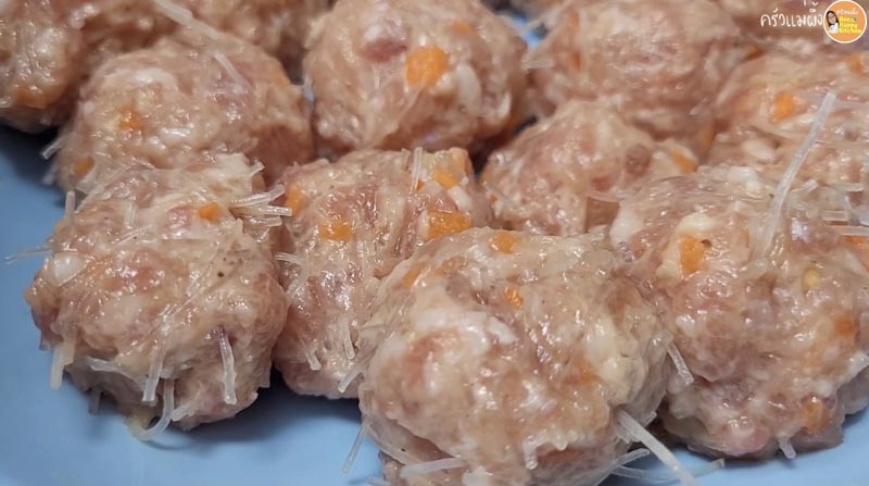 ► ปั้นหมูสับเป็นก้อนกลม ๆ สูตรนี้จะได้ประมาณ 12-15 ลูก แล้วแต่ขนาดที่ชอบเลยค่ะ