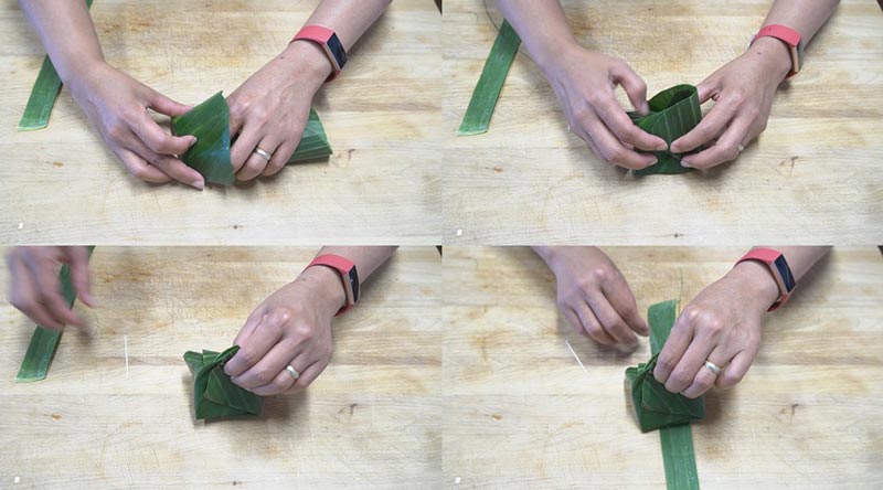 ► ขั้นตอนการใส่กระทง ใครมีความสามารถทำกระทงก็ทำได้เลยนะคะ ตาเป็นคนที่ทำกระทงไม่เป็น ส่วนมากเวลาทำกินจะใส่ถ้วยฟอยล์ง่ายมากและสะดวก แต่วันนี้อยากกินแบบห่อใบตองจะได้ความหอมจากใบตองเวลานึ่งสุก ที่อเมริกามีใบตองแบบแช่แข็งนำมาละลาย ตัดตามรูป จริง ๆ เป็นคนที่ห่อไม่เป็นเลยค่ะ แต่จะพยายามก็ออกมาใช้ได้ค่ะ