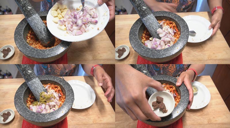 ► พอเริ่มละเอียดจะใส่หอมแดง กระเทียม ผิวมะกรูด และกะปิ แล้วตำรวมกันให้ละเอียด