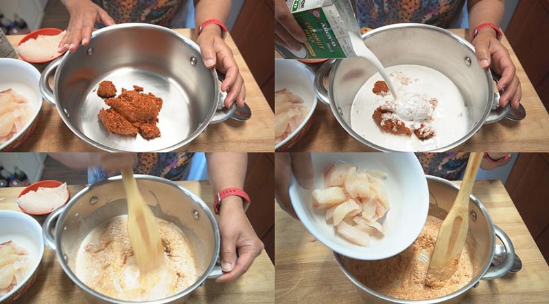 ► มื่อน้ำพริกละเอียด เราก็จะเริ่มมาผสมกันค่ะ โดยหาหม้อมาใส่เครื่องพริกแกงลงไป เติมกะทิกล่อง คนส่วนผสมให้เข้ากัน ใส่ปลาหั่นเป็นชิ้นลงไป
