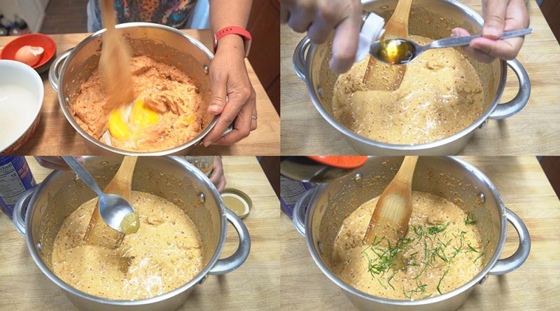 ► ใส่ไข่แล้วคนให้เข้ากัน ปรุงรสด้วยน้ำปลากับน้ำตาลปี๊บ ใส่ใบมะกรูดซอย