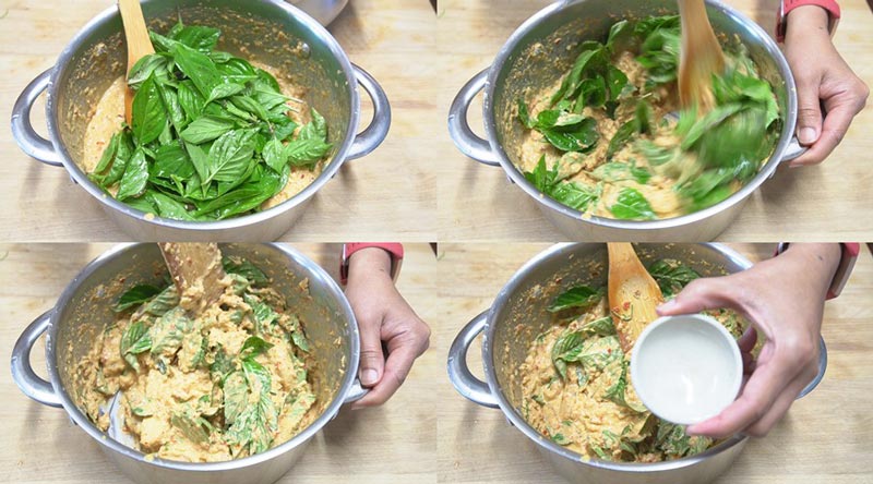 ► จากนั้นจะทำการคน ขั้นตอนนี้ใช้เวลานานสักหน่อยนะคะ เพื่อให้เนื้อปลาฟูและส่วนผสมเข้ากัน เน้นเลยว่าต้องคนจนส่วนผสมเหนียวข้น จากนั้นจะใส่ใบโหระพาค่ะ บางคนชอบที่จะรองก้นกระทงก็ได้นะคะ แต่ส่วนตัวเป็นคนชอบกินผักที่ผสมกันในเนื้อห่อหมก เลยจะใส่ในขั้นตอนนี้เลย แล้วคนให้เข้ากัน ไม่ต้องคนนานหลังจากใส่ผักใบโหระพานะคะ เดี๋ยวผักช้ำหมด