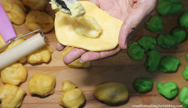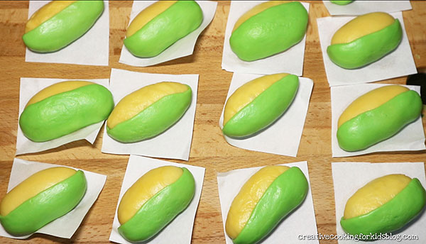 • จากนั้นคลึงแป้งสีเขียวให้เป็นแผ่นบาง นำไปห่อแป้งสีเหลือง แล้ววางบนกระดาษซาลาเปา ตามภาพ