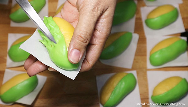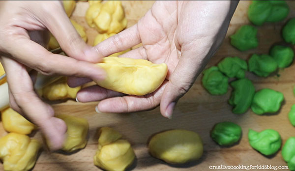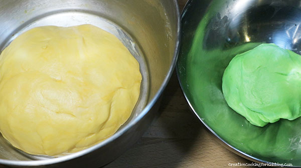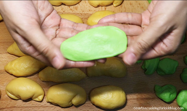 • ตัดแบ่งแป้งทั้ง 2 สีเป็นก้อนเล็ก ๆ สีเหลืองก้อนละ 30 กรัม และสีเขียวก้อนละ 10 กรัม