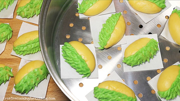 • พอแป้งขึ้นแล้ว เปิดไฟนึ่งในน้ำเดือด 10 นาที ก็จะได้ซาลาเปาทุเรียนอร่อยหอมฟิน ๆ แล้วค่ะ