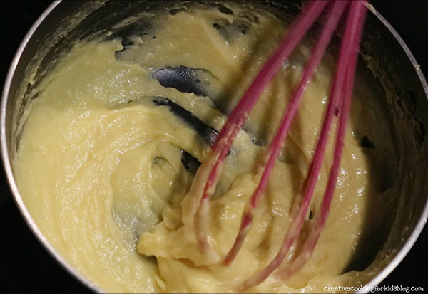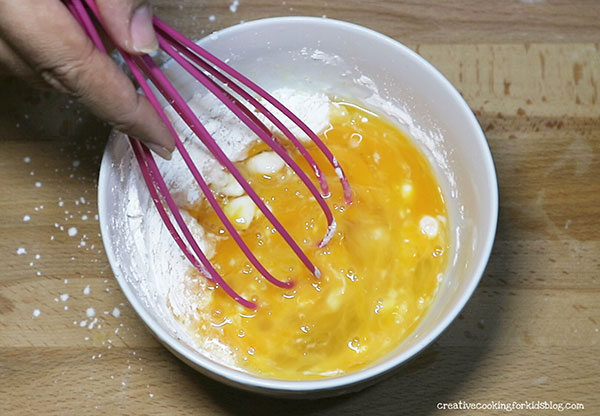 • ผสมไข่ไก่ แป้งข้าวโพด ผงคัสตาร์ด และน้ำตาลทราย 3 ช้อนโต๊ะ